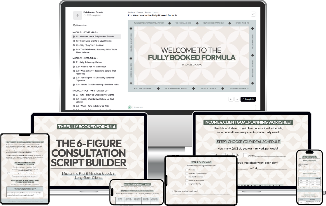 Your foundation for a 6-figure chair. For the price of a single toner, you're getting the exact system I used to stop the hustle and start seeing predictable income.